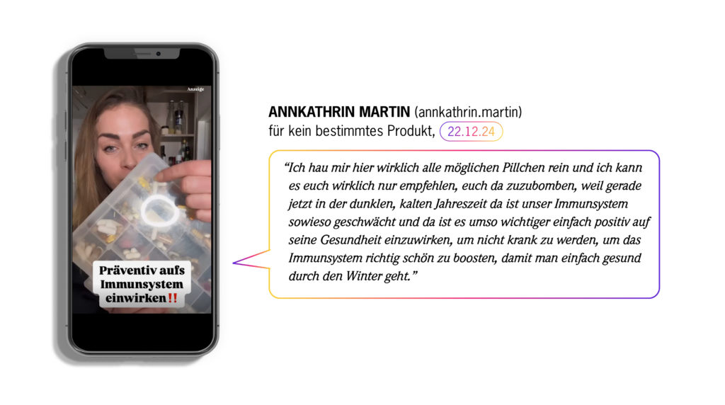 - Fehlende Transparenz: Die fehlende Kennzeichnung als Werbung lässt werbliche Inhalte als persönliche Empfehlungen erscheinen. Es werden systematisch wichtige Informationen zu Dosierung, möglichen Neben- oder Wechselwirkungen sowie Risiken einer Überdosierung weggelassen.